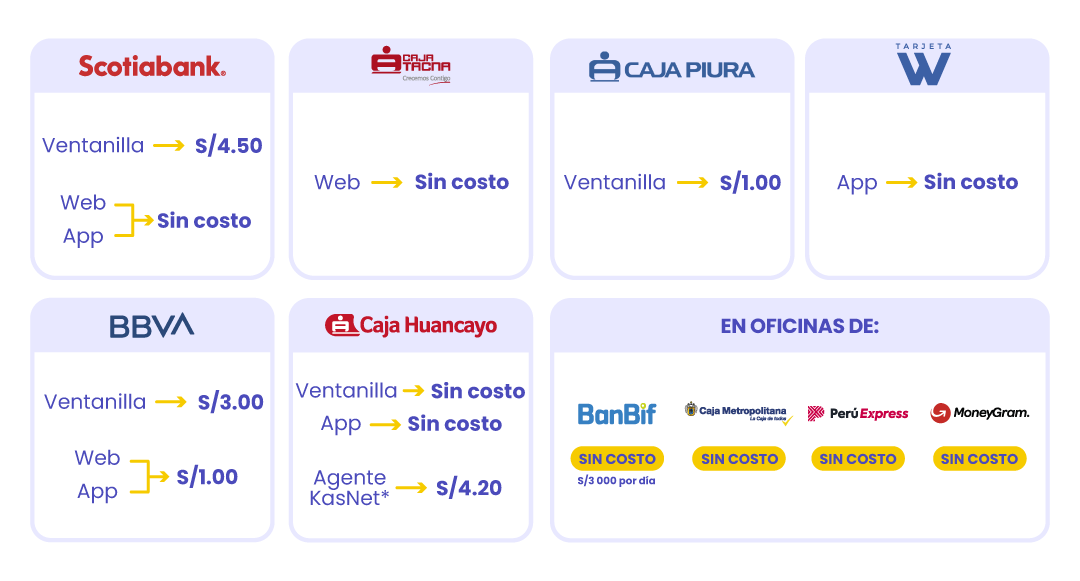 En ventanillas de Caja Huancayo Satipo, Oxapampa, Tingo María, Concepción, Ayacucho, San Francisco, Pangoa, Acobamba, Perené, Mazamari, Tocache, San Ramón, Pichari – Cusco, José Crespo y Castillo – Huánuco, La Esperanza, Trujillo y Aguas Verdes, el costo será de S/12.00 por montos mayores a S/10 000 – 0.12%