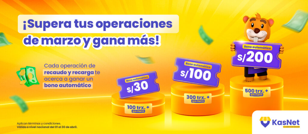 (ii) Realicen como mínimo 100 operaciones de recaudos y recargas adicionales en comparación con marzo, usando su POS KasNet. No se consideran consultas.